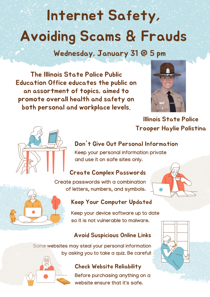 Internet Safety, Avoiding Frauds & Scams Posted bygpldJanuary 29, 2024April 29, 2024Posted inPrograms Internet Safety: Avoiding Scams & FraudThe IL State Police will be at the library on Wednesday, January 31 at 5:00 pm with a program on Internet Safety. Related