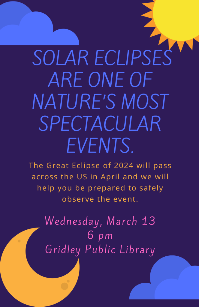 Prepare for the Solar Eclipse! Posted bygpldFebruary 13, 2024April 29, 2024Posted inPrograms Wednesday, March 13, 6 pmPrepare for the Solar Eclipse on April 8, 2024! Related