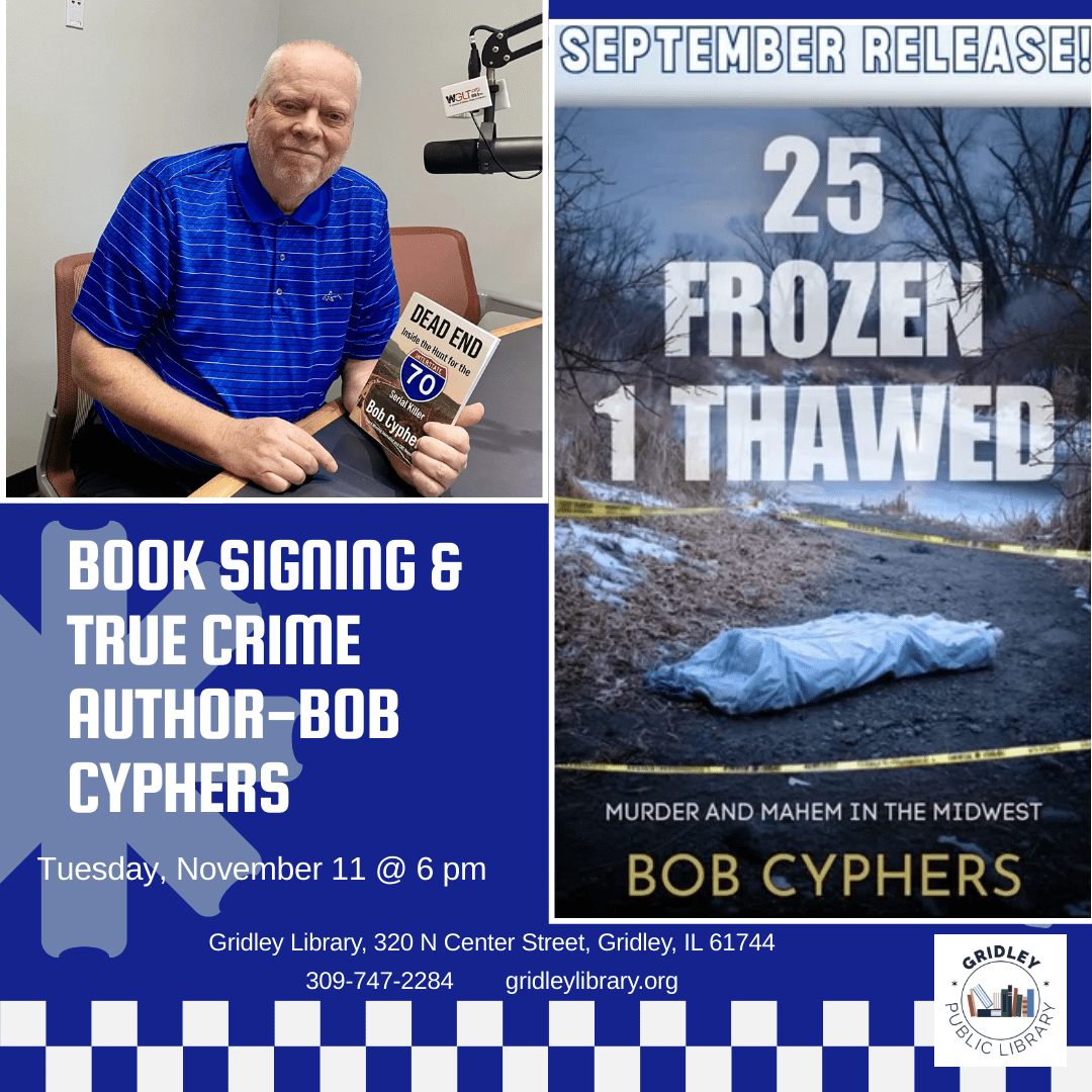 Join us on Tuesday, November 11 @ 6 pm at the Library with Bob Cyphers, former reporter, current author as he discusses and signs his new book “25 Frozen 1 Thawed” set to release this September.