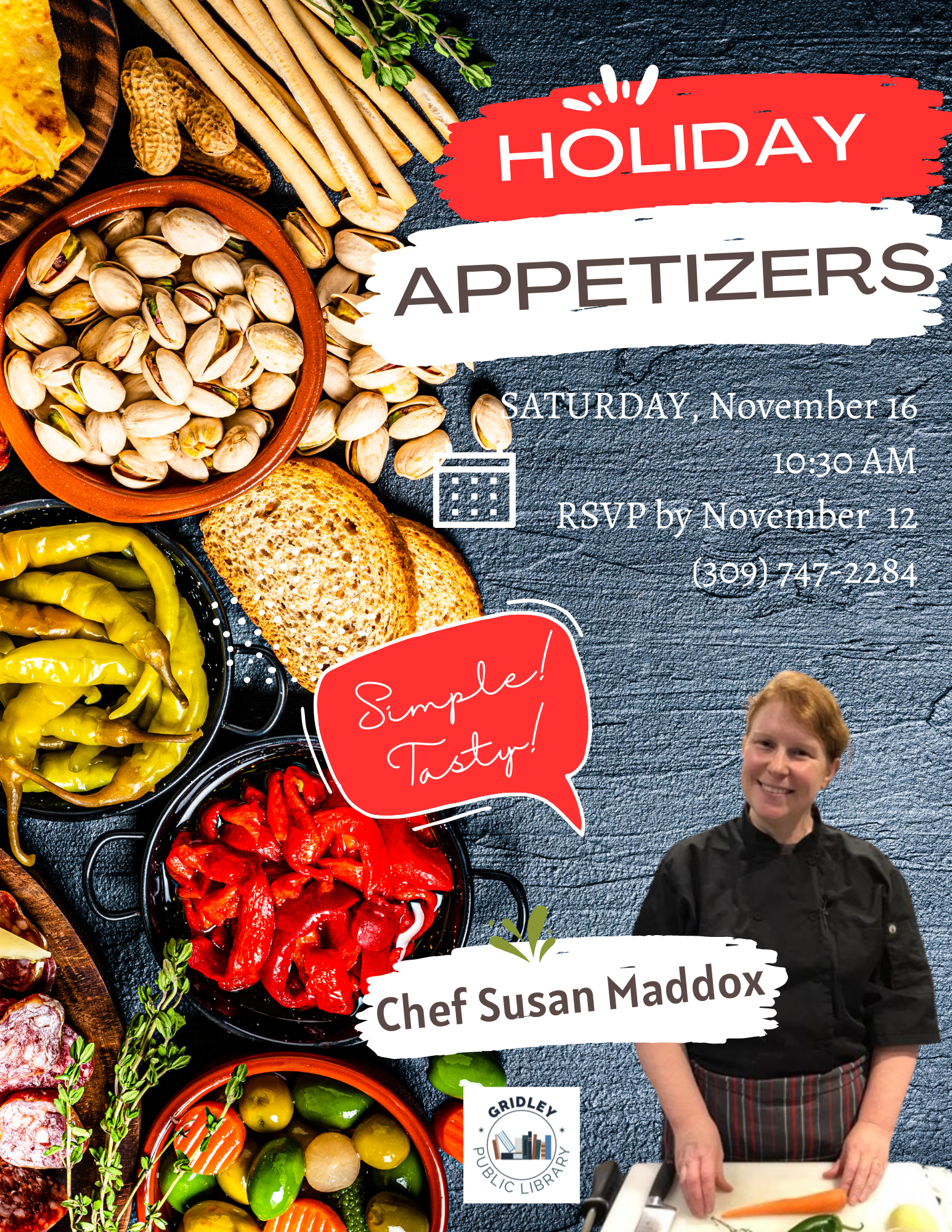 Please call the library to reserve your spot and guarantee recipe copies! Susan will demonstrate 3-4 recipes and explain various methods and techniques involved in preparing the recipes.